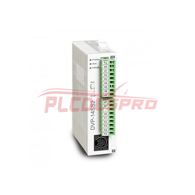 TheDVP14SS11T2е компактен PLC от серията DVP-SS на Delta, предлагащ 8 цифрови входа и 6 транзисторни изхода за основен контрол и прости приложения за движение.